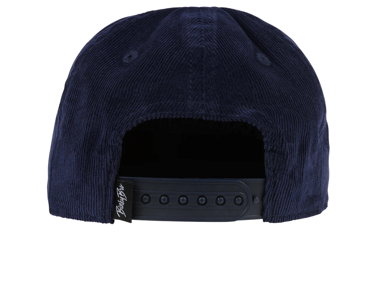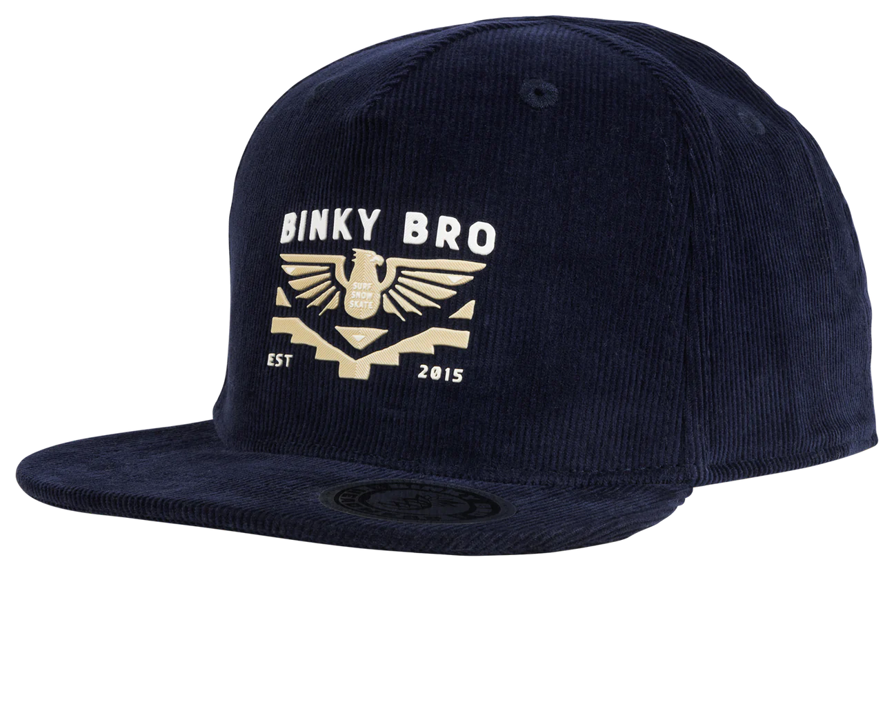 The Phoenix snapback hat has all navy blue colored corduroy paneling with a BinkyBro Phoenix embossed logo on front. This hat is 100% cotton.