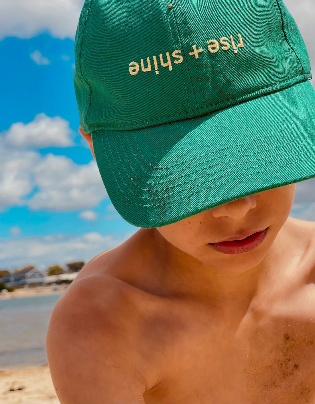 Embroidered with contrasting colour 'rise + shine' text (intentionally upside down because we enjoy a little quirky fun!) representing that sluggish start to the day where we should wake up, embrace life & begin the day with a smile. Happiness is contagious.
