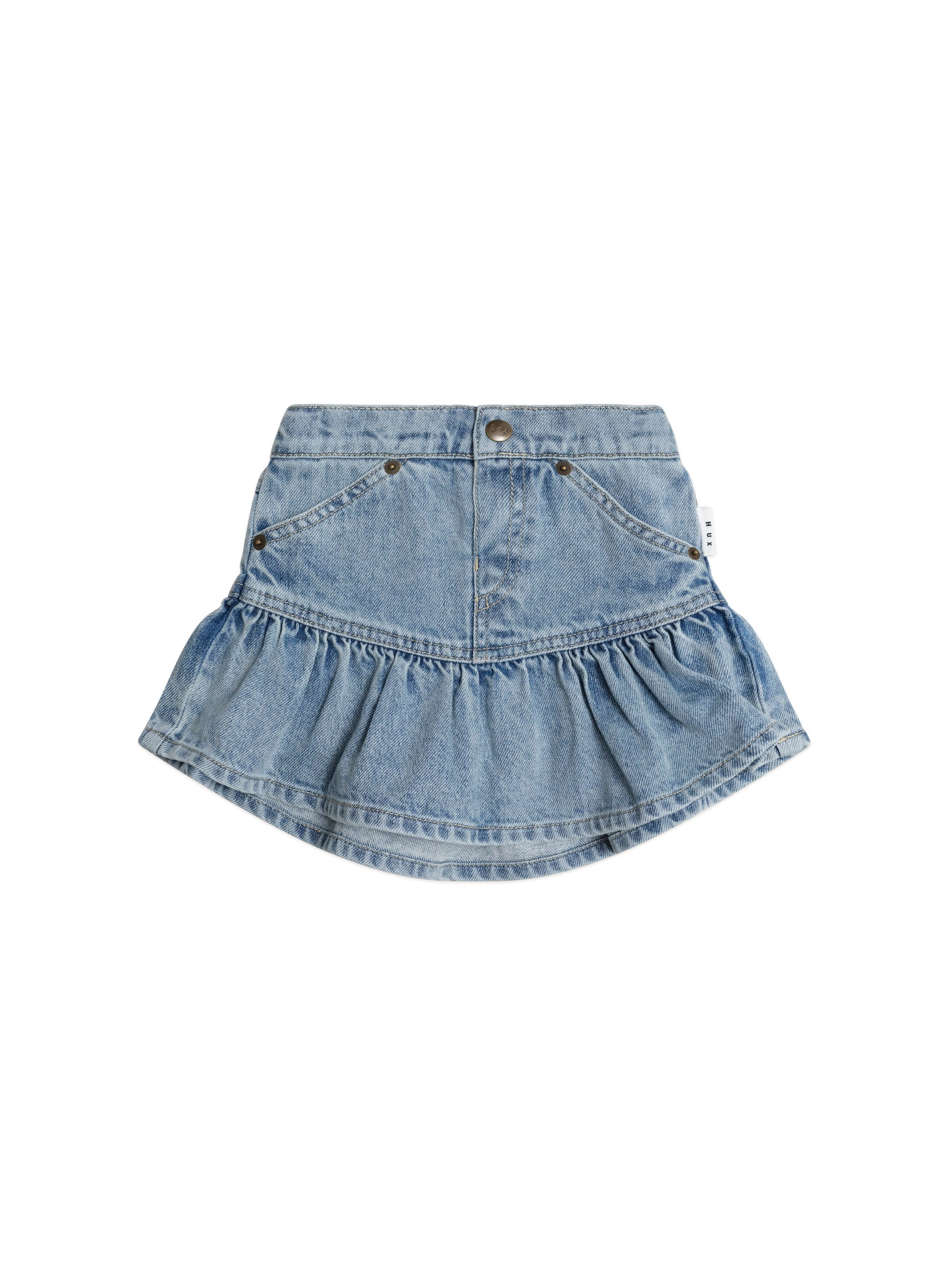The kind of skirt they'll want to wear again and again. This 90s style mini is made from deliciously dreamy denim in in quintessential blue. It features a stretchy waistband, side and back pockets and a pretty frill flare hem.