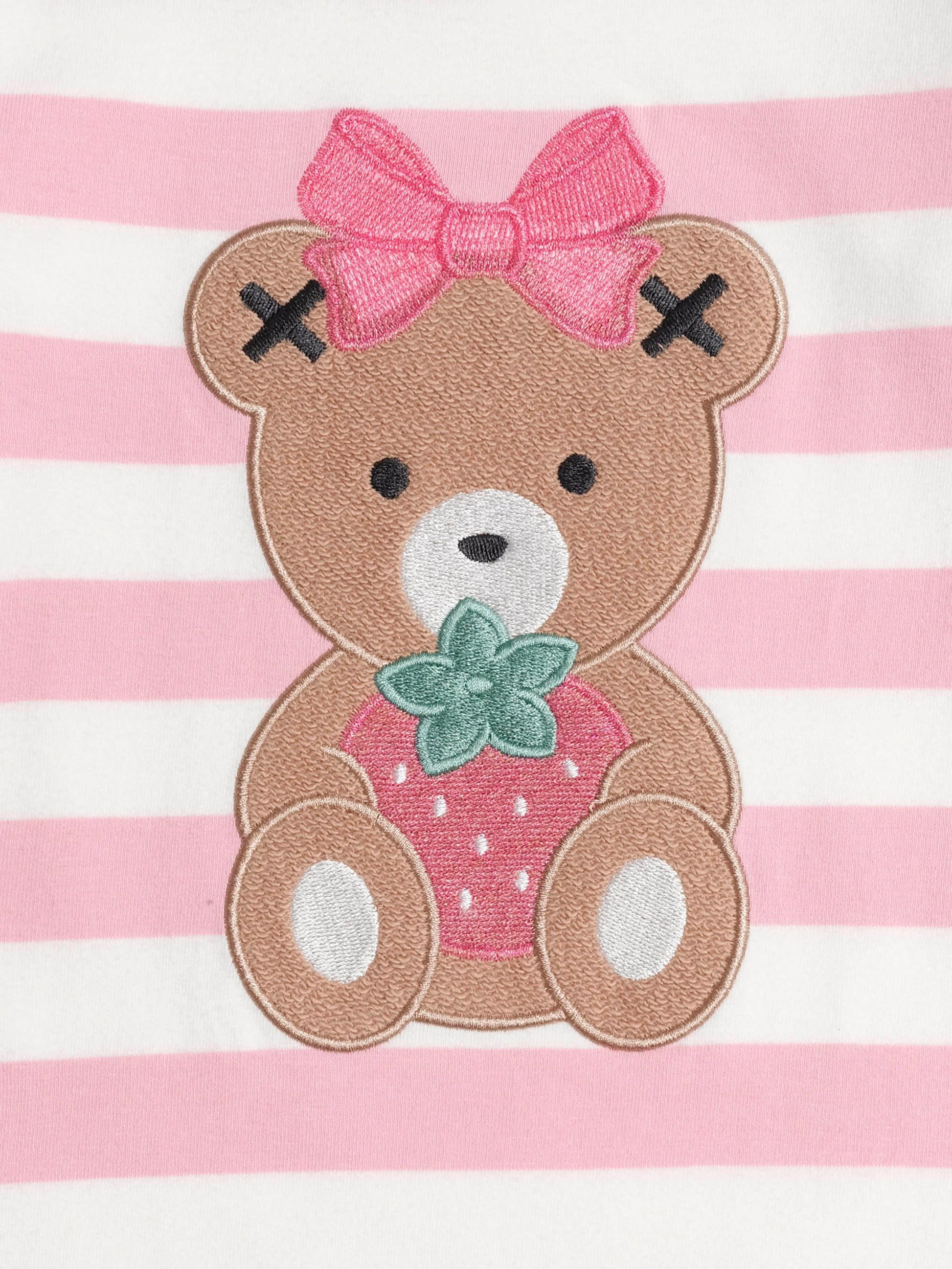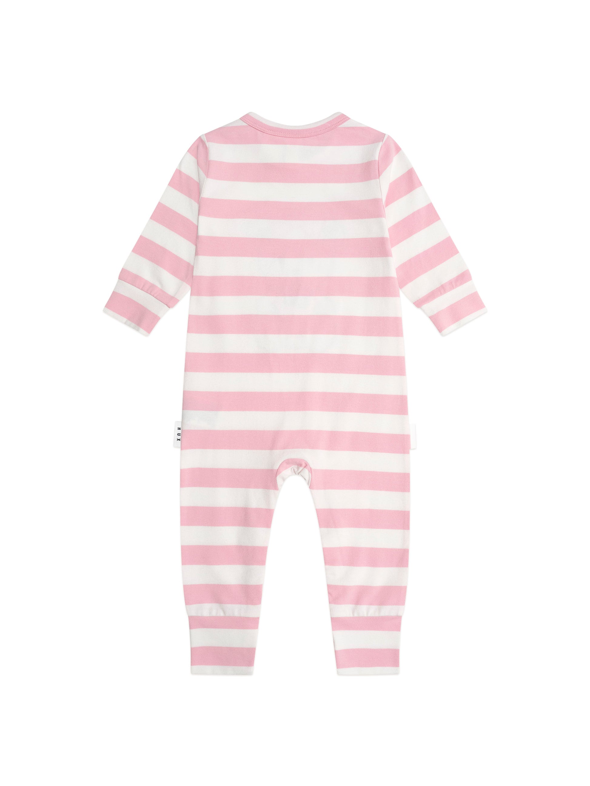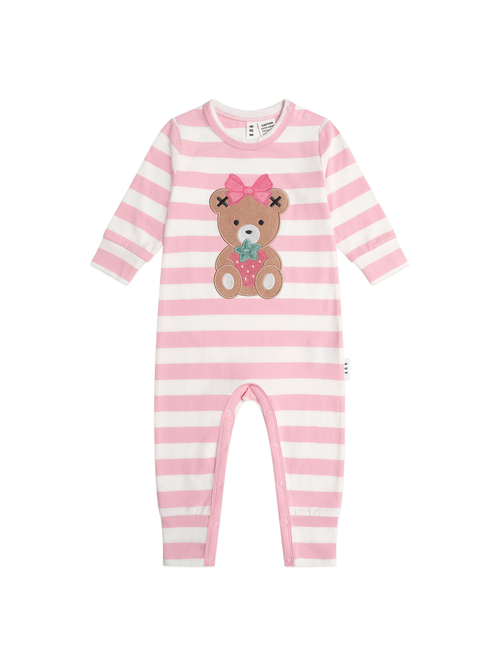 A marshmallow-soft striped romper with fun and furry Huxbear embroidery. Consciously crafted from premium organic cotton, it has stainless steel snaps at the shoulder and crotch for super snappy dressing. Just add squishy legs.