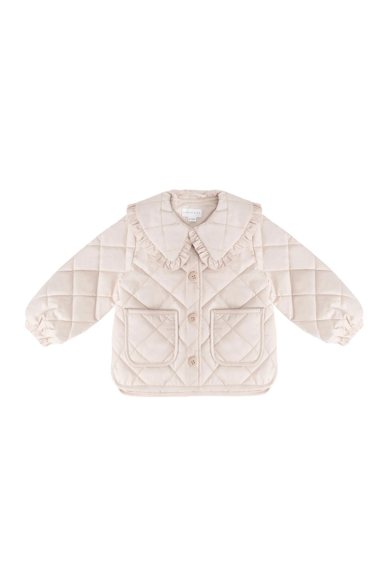 Wrap your little one in warmth and whimsy with the Kora Jacket in Berry Cloud, a beautifully quilted puffer jacket on a soft pinky-berry base. With a charming frill collar, front buttons, and two handy pockets, this jacket is as practical as it is pretty – perfect for layering on cooler days.