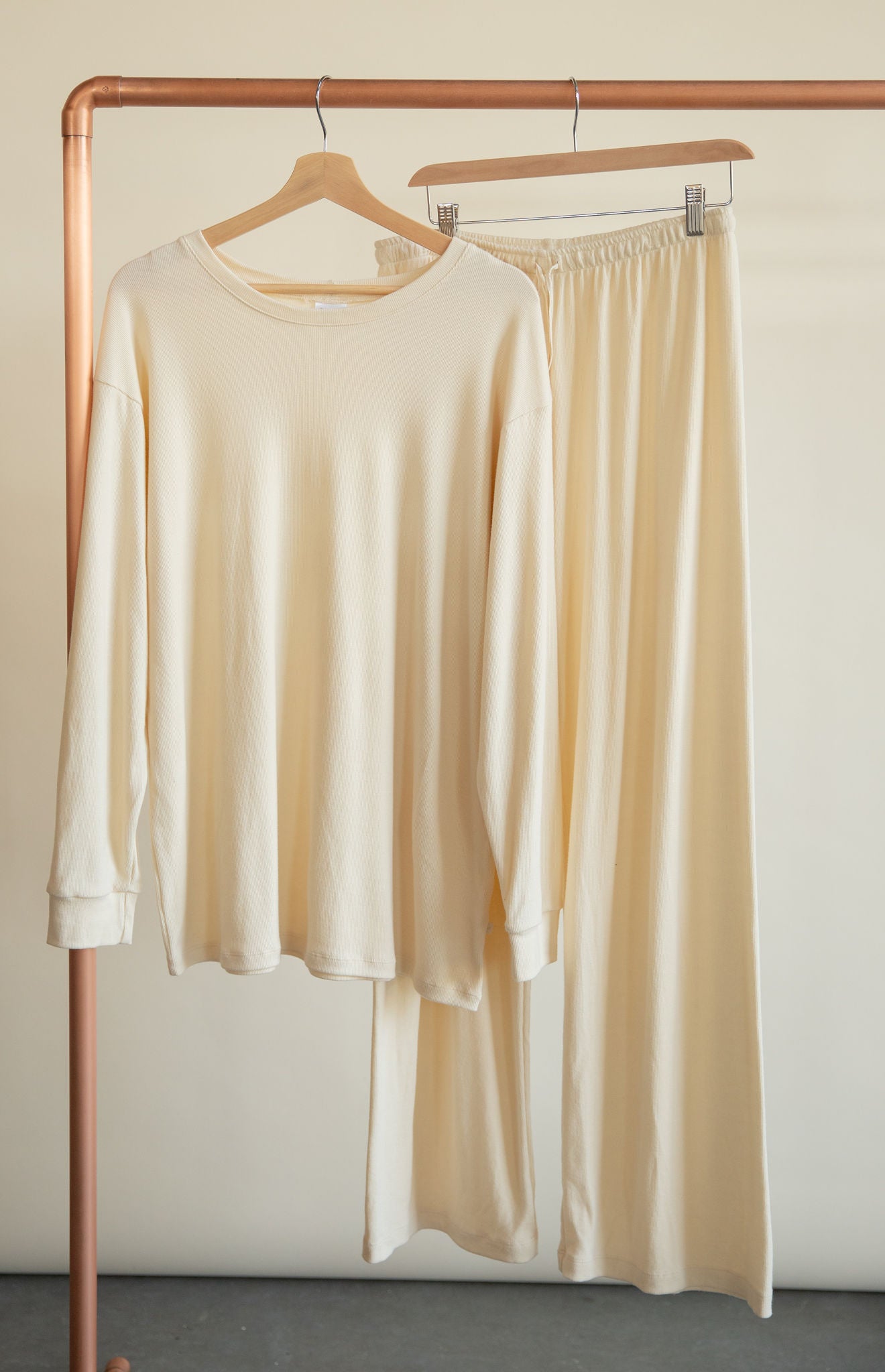 Our Ladies Ribbed Lounge Set features a relaxed long sleeve shirt, and wide leg pants. Wear it as sleepwear or loungewear, or mix and match with your favourite J&L items for a cozy fall outfit!