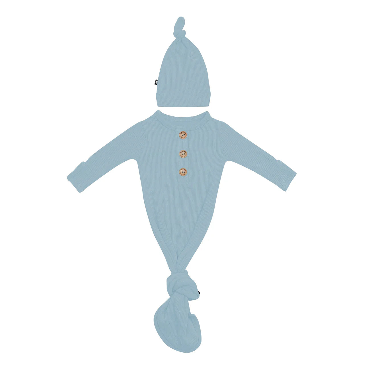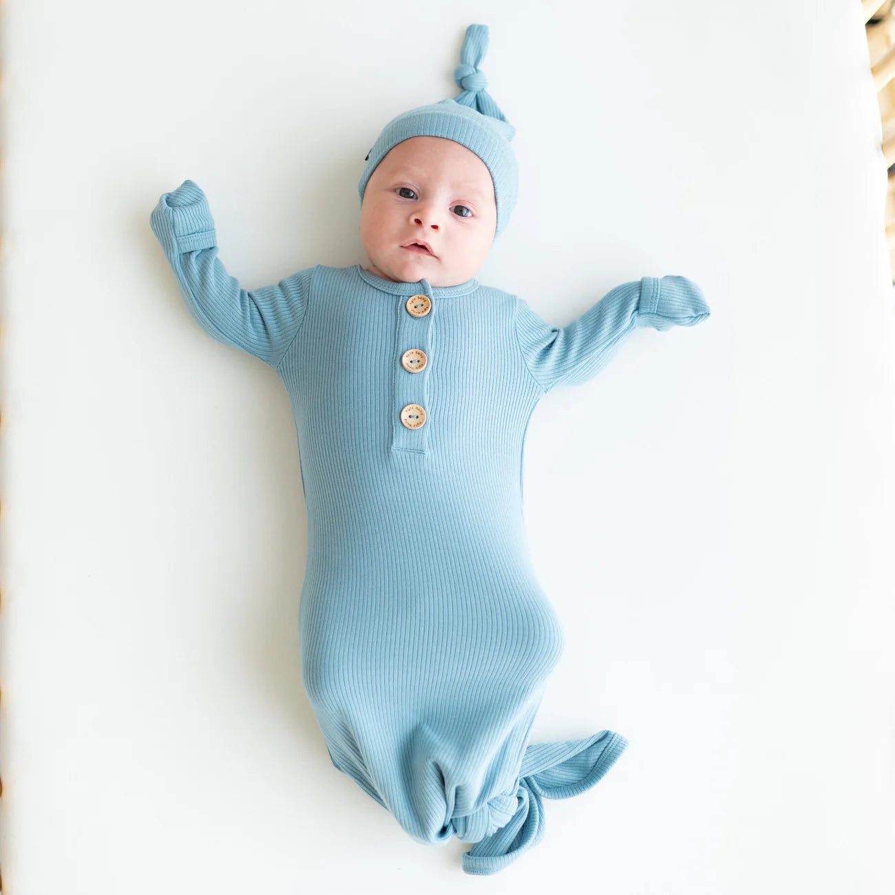 Kyte Baby Ribbed Knotted Gown with Hat Set || Dusty Blue