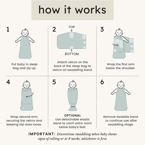 Disclaimer: Following safe swaddling practices, remove the wrap once your baby is 8 weeks old or able to roll over, whichever one comes first. The wrap is intended to only be used with its corresponding sleep bag in size XS.