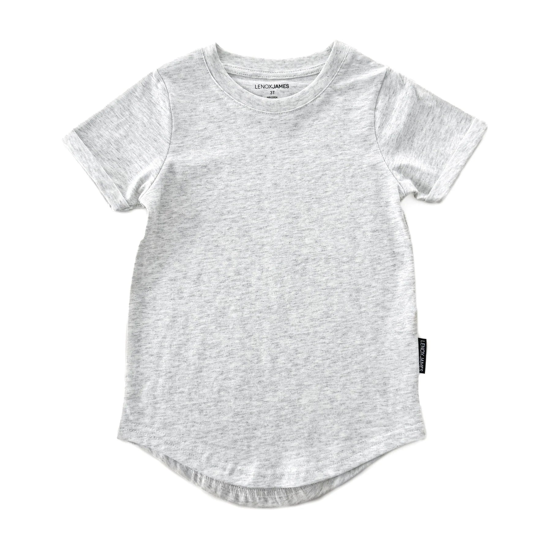 Introducing our classic ash-colored crewneck tee, a must-have addition to your child's wardrobe. Crafted with care, this tee features rolled hemmed sleeves and a curved hem with a slightly longer back for a stylish touch.