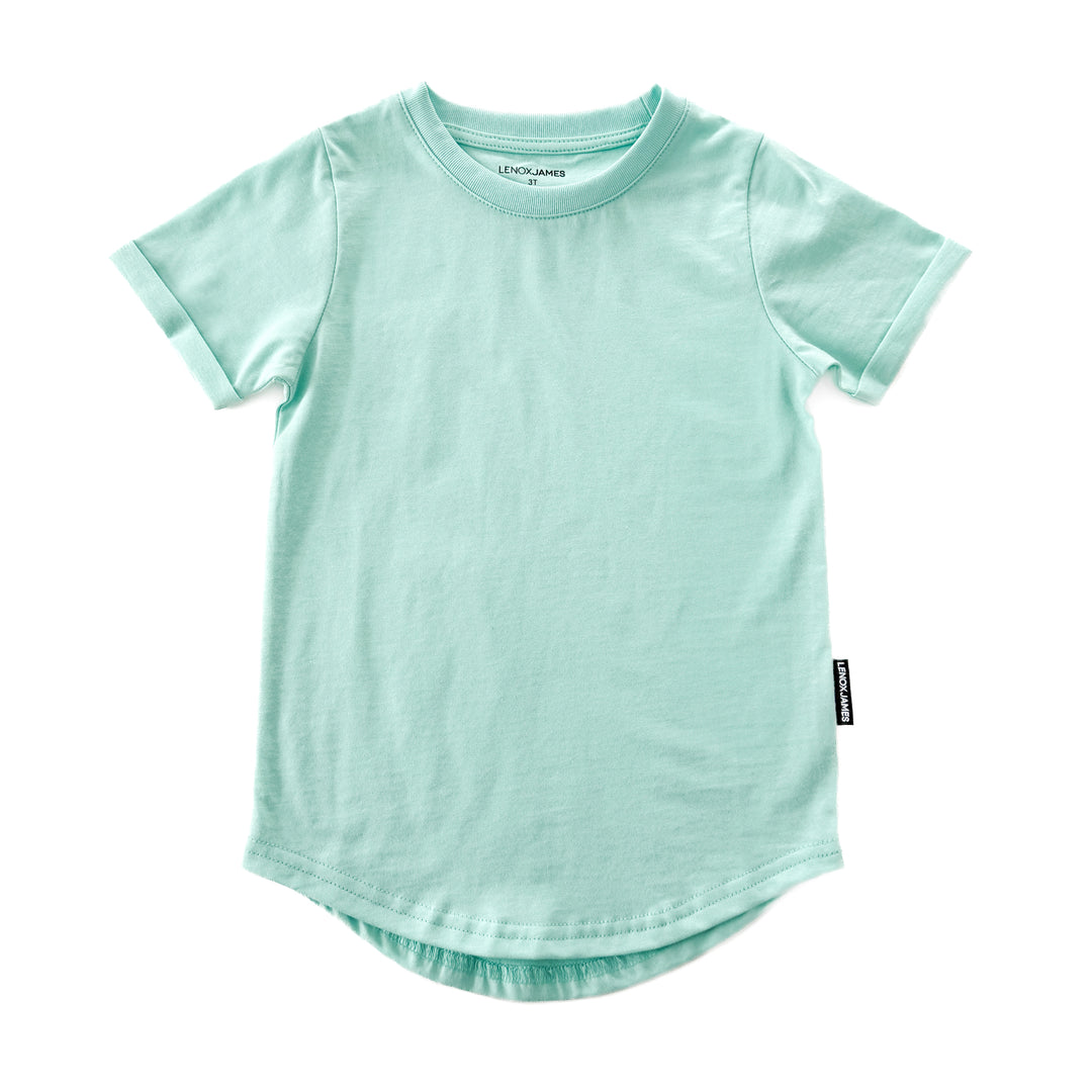 Introducing our vibrant cruise-colored crewneck tee, a must-have addition to your child's wardrobe. Crafted with care, this tee features rolled hemmed sleeves and a curved hem with a slightly longer back for a stylish touch.