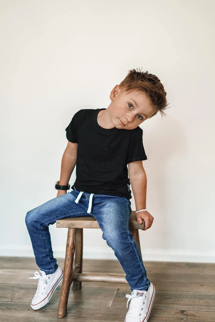 Meet your new favourite jeans.The Little Bipsy Classic Denim makes any outfit look effortlessly cool. These jeans were designed with an elastic waistband + functioning drawstring for easy dressing, as well as a versatile black wash, 4-way stretch fabric, and a straight leg fit for all day comfort + non-restricting play.