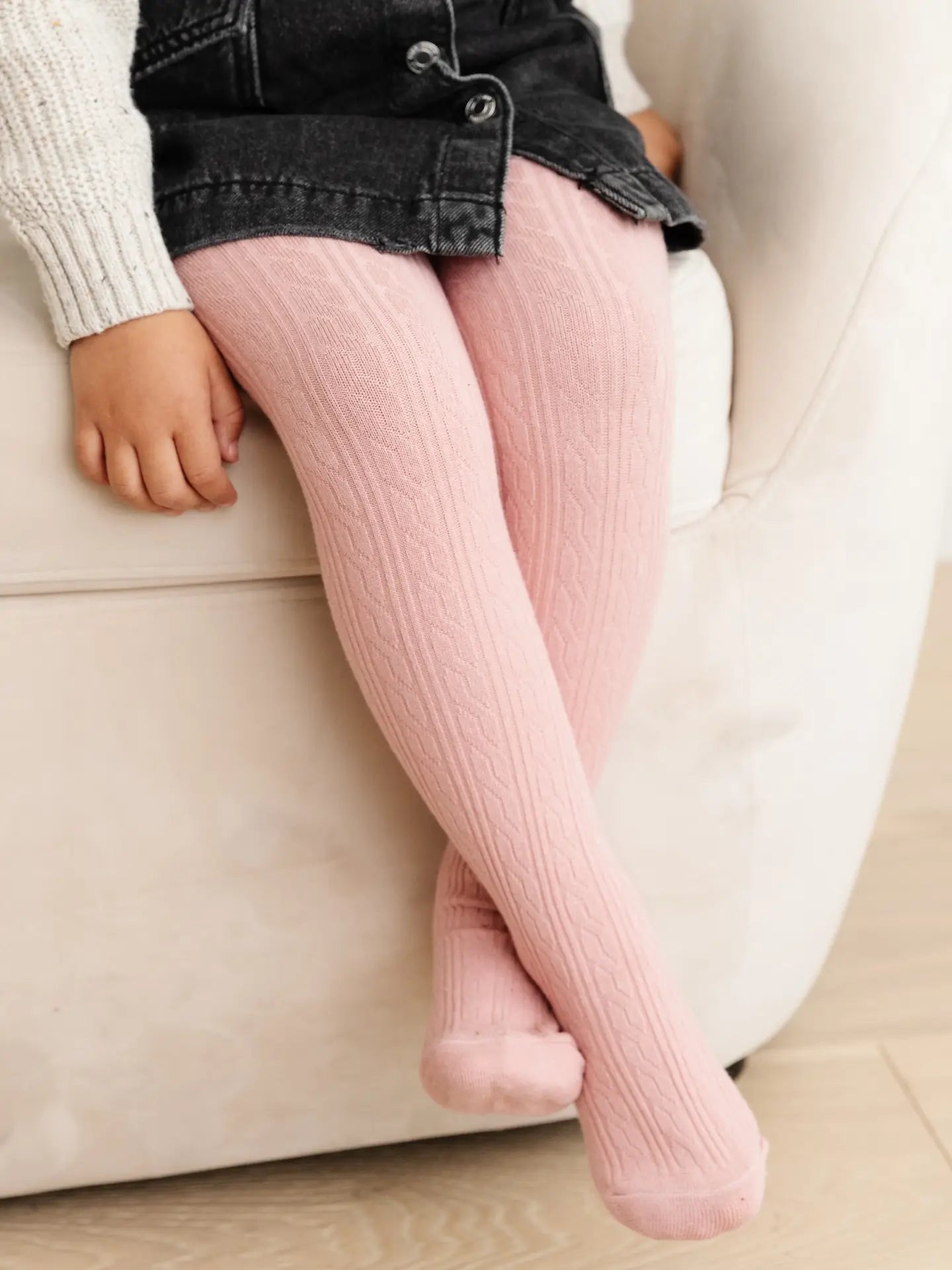 Blush Cable Knit Tights for babies, toddlers and children! Classic. Cute. Durable. And now better than ever! Our cable knit tights are now made with a higher quality yarn that is even softer and more durable than before!