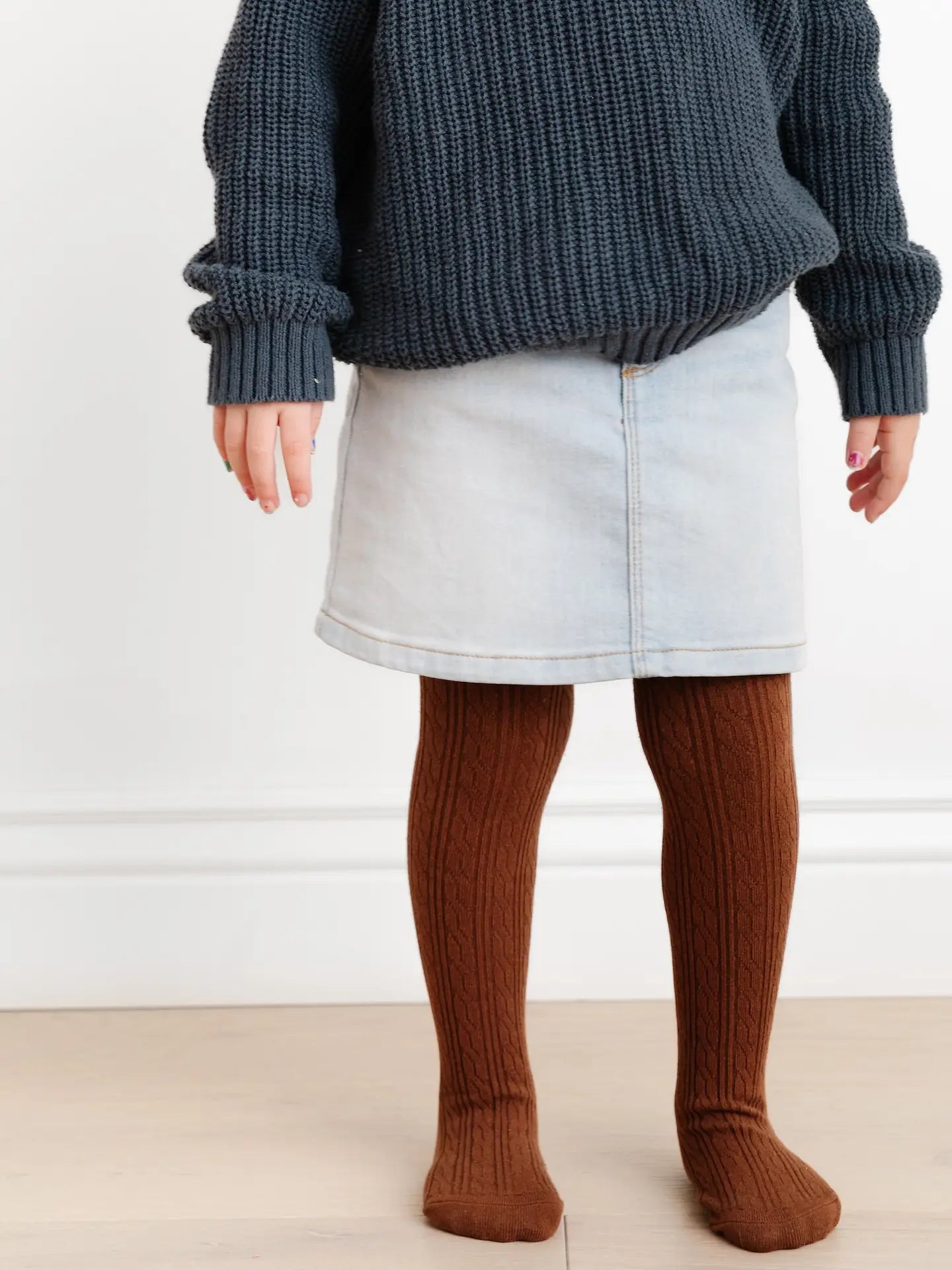 Brown Cable Knit Tights for babies, toddlers and children! Classic. Cute. Durable. And now better than ever! Our cable knit tights are now made with a higher quality yarn that is even softer and more durable than before!
