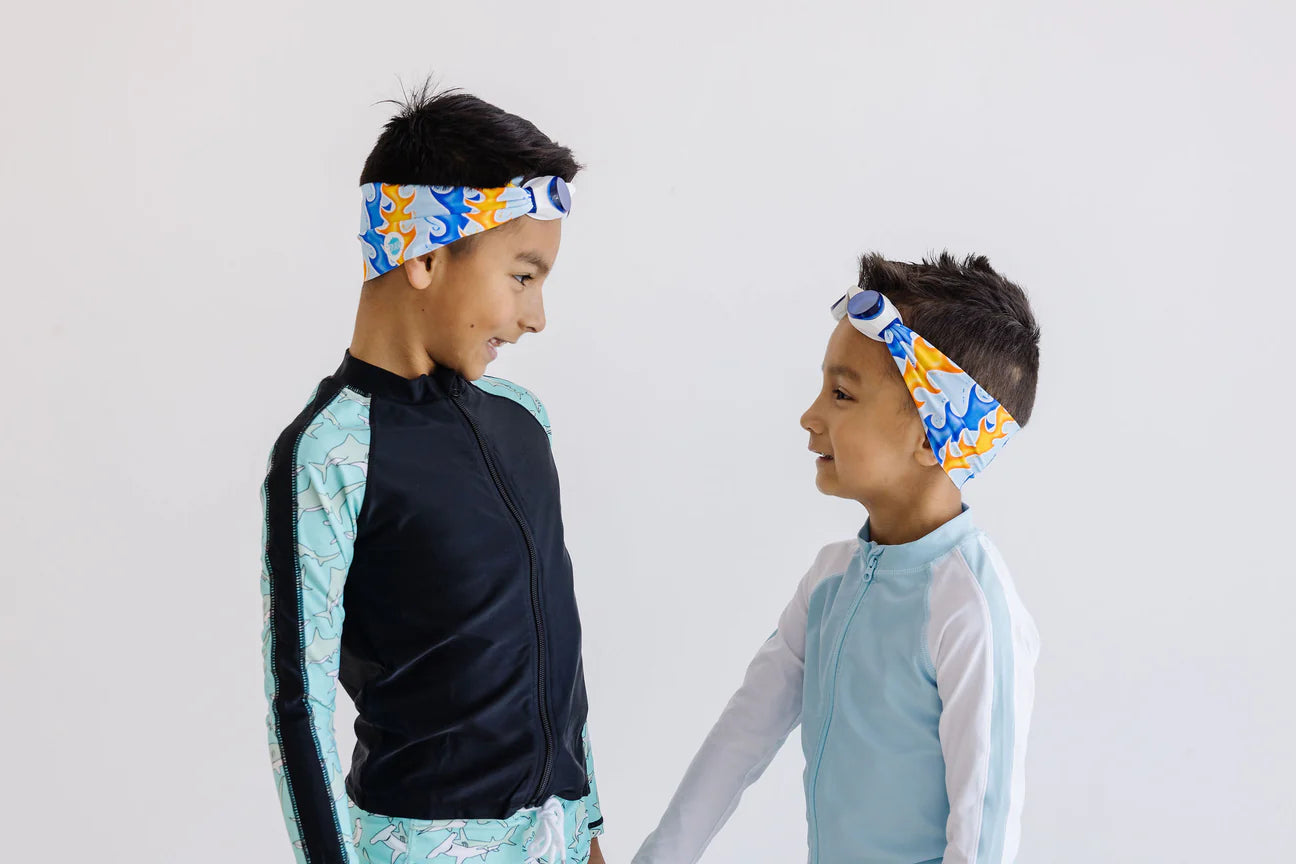Our Blaze swim goggle features our tangle-free strap in a blue and orang flame print on a light blue background paired with white frames and lightly tinted blue lenses.
