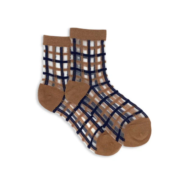 XS Unified Women's Sheer Plaid Ankle Socks || Navy/Caramel