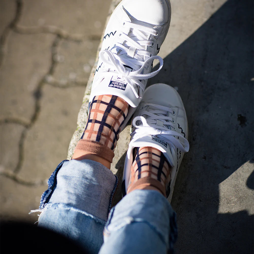 Sheer anklet with plaid pattern. Wear with sneakers, heels or sandals.